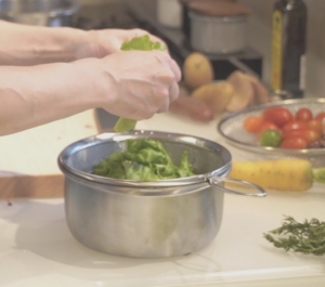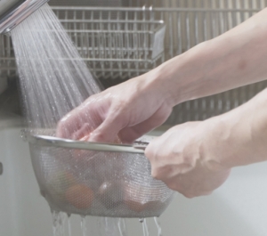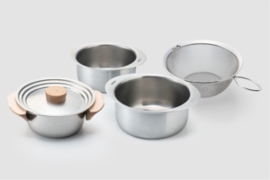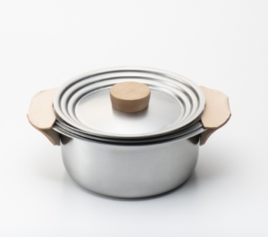 蓋つまみ:天然木 / ザル:18-8ステンレス/鍋つかみ:革